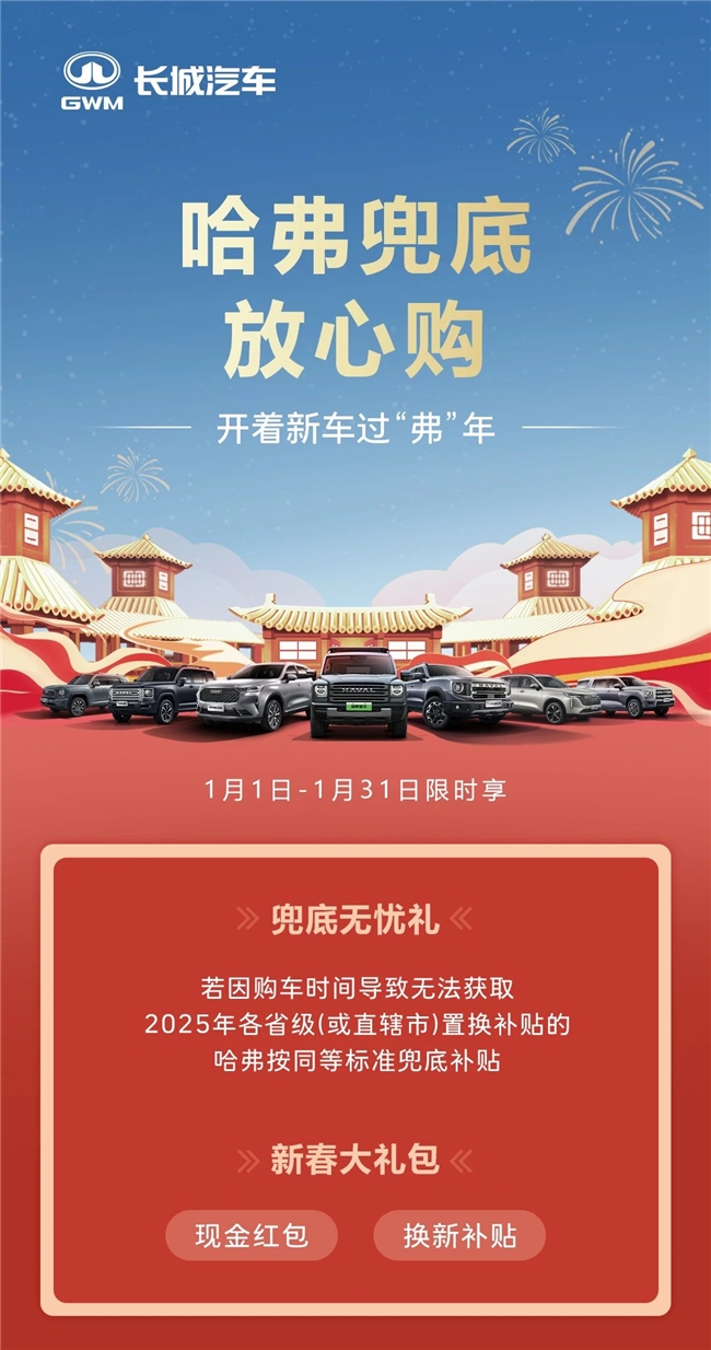 身未动,心已远,就让哈弗猛龙陪你回家过个幸福年吧。现在购车不仅可享受新潮礼、感恩礼、置换礼、金融礼、保养礼、流量礼、安心礼、无忧礼8重大礼包,更可额外享受兜底无忧礼——1月31日前符合条件的购车用户,若因当地政府未推出2025年政策而无法获取地方置换补贴的,哈弗猛龙按2024年同等标准兜底补贴(详情请咨询当地经销商)。岁末将至,敬颂冬绥,让哈弗猛龙和你一起喜迎幸“弗”年!