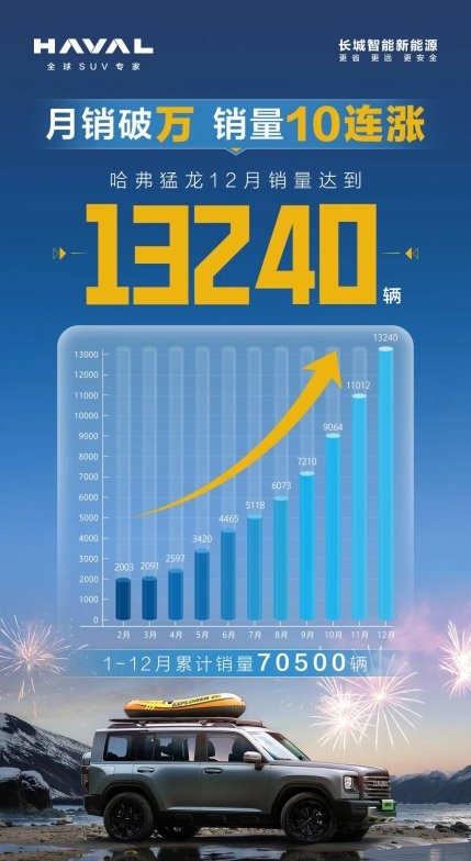 新能源汽车市场日益繁荣的今天,各大品牌纷纷花式宣传,试图在这个充满机遇与挑战的领域站稳脚跟。其中,哈弗猛龙作为一款现象级车型,无疑值得深入解读。它没有依靠铺天盖地的广告宣传赚取声量,也没有通过价格战来抢占市场,却凭借过硬的产品实力和精准的市场定位,在竞争激烈的20万级新能源SUV市场中脱颖而出,2024年2-12月实现了销量“10连涨”的佳绩,全年累计销量达到了70500辆,稳居细分市场销量榜首。这一现象不仅让人好奇,哈弗猛龙究竟是如何做到的?
