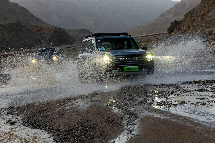 车辆还配备了雪地、沙地、泥地等七种驾驶模式,足够应对各种复杂地形。在阿拉善穿越中,沙地模式发挥了关键作用,全时四驱,前后桥驱动力控制与底盘系统配合,动力随路面变化自动调整,行进更从容不迫。