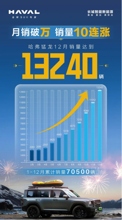 伴随新能源汽车被广泛认可,新能源泛越野这一小众赛道也迎来了高声量、大流量的蓬勃发展机遇,在市场“角力”中,哈弗猛龙硬核破局,靠产品口碑打出了知名度——2024年11月单月销量破万,卖出11012辆,12月13240辆再创新高,2-12月份成功实现销量10连涨。二季度销售额涨幅26.27%,三季度涨幅75.54%,四季度更是涨幅81.05%。稳定增长的销售额不仅代表了哈弗猛龙在市场上的竞争力逐渐增强,更代表了用户对哈弗猛龙的认可与喜爱,以及市场对哈弗猛龙的旺盛需求!哈弗猛龙究竟有何魅力,能够实现口碑裂变,勇夺新能源泛越野销冠?