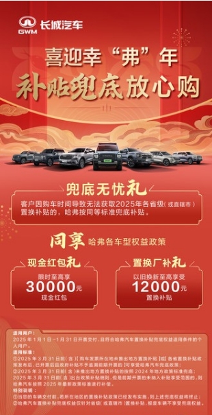 心动不如行动,现在购车不用愁,除了新潮礼、感恩礼、置换礼、金融礼、保养礼、流量礼、安心礼、无忧礼8重大礼包,哈弗猛龙还给你兜底无忧——若因购车时间导致无法获取2025年各省级(或直辖市)置换补贴的,哈弗猛龙按同等标准兜底补贴。诚邀各位朋友就近前往经销商门店进行咨询,了解更多购车详情及优惠政策。时不我待,新能源泛越野销冠哈弗猛龙,2025喜迎幸“弗”年,静待与你相遇!