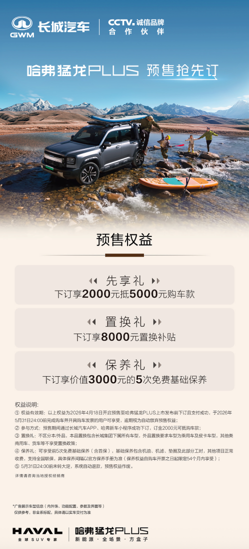 4月24日至5月3日,敬请莅临北京车展哈弗展台,近距离感受猛龙家族的硬核魅力与棱角精神。猛龙PLUS全系预售仍在火热进行中,七座版具体配置及价格信息,敬请关注车展现场发布。